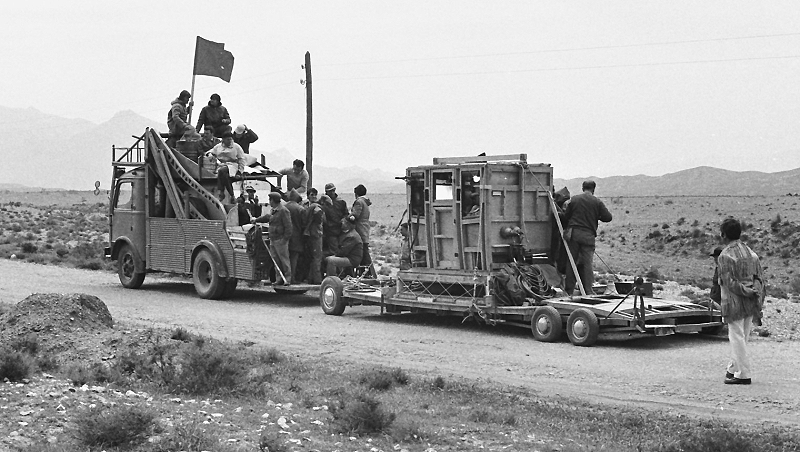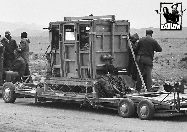 | A great photo that represents the good old days of Almeria. Everything was possible. It took me some time to find out what is going on here. This unusual trailer was tinkered together for the movie 'Catlow'. A special coach with plenty of horsepower! It was used to film the funny 'poker scene' inside/outside of the coach. |